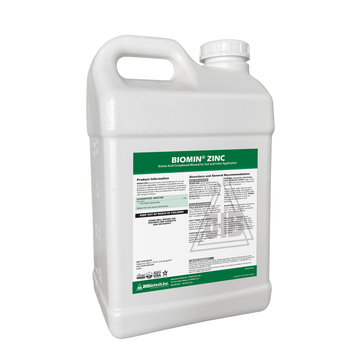 Biomin® Zinc contains complexed zinc for soil and/or foliar application. Completely bioavailable and non-phytotoxic to plants when applied in accordance to directions. Designed to prevent and correct zinc deficiencies and to boost crops during critical or fast-growing periods. May be applied with nitrogen fertilizers.
