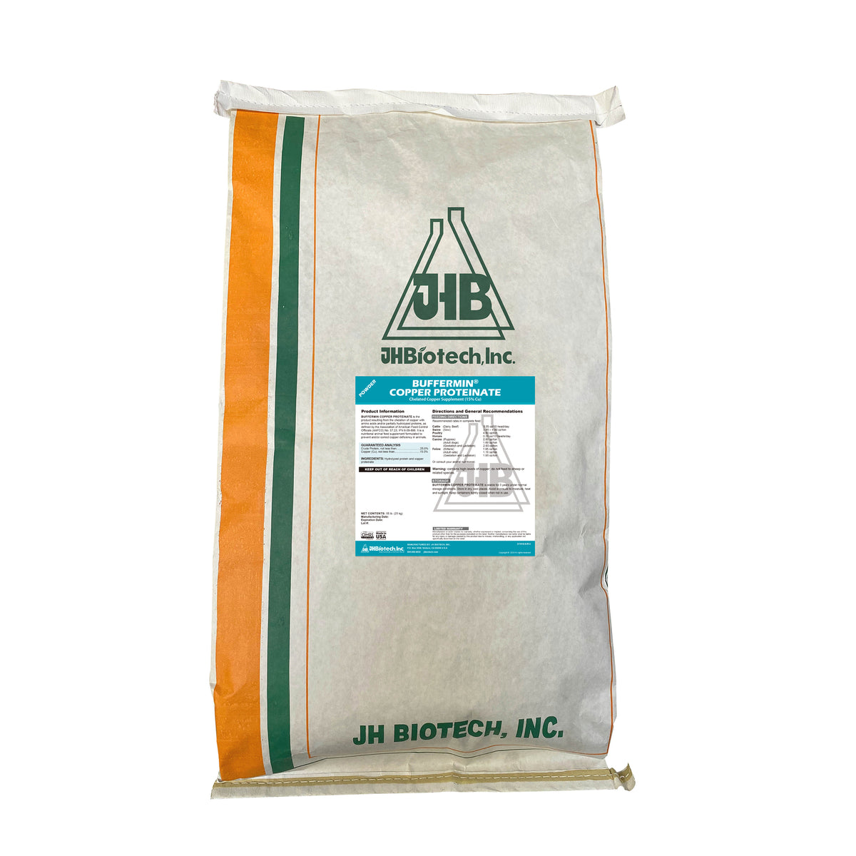 Buffermin Copper Proteinate results from the chelation of copper with amino acids and hydrolyzed proteins. It is a nutritional animal feed supplement formulated to prevent and correct copper deficiency in animals. Buffermin® Proteinates are a line of chelated trace minerals that combine an amino acid and hydrolyzed protein source with an essential mineral. They are designed to have a vastly higher degree of bioavailability than traditional inorganic minerals such as sulfates or oxides.