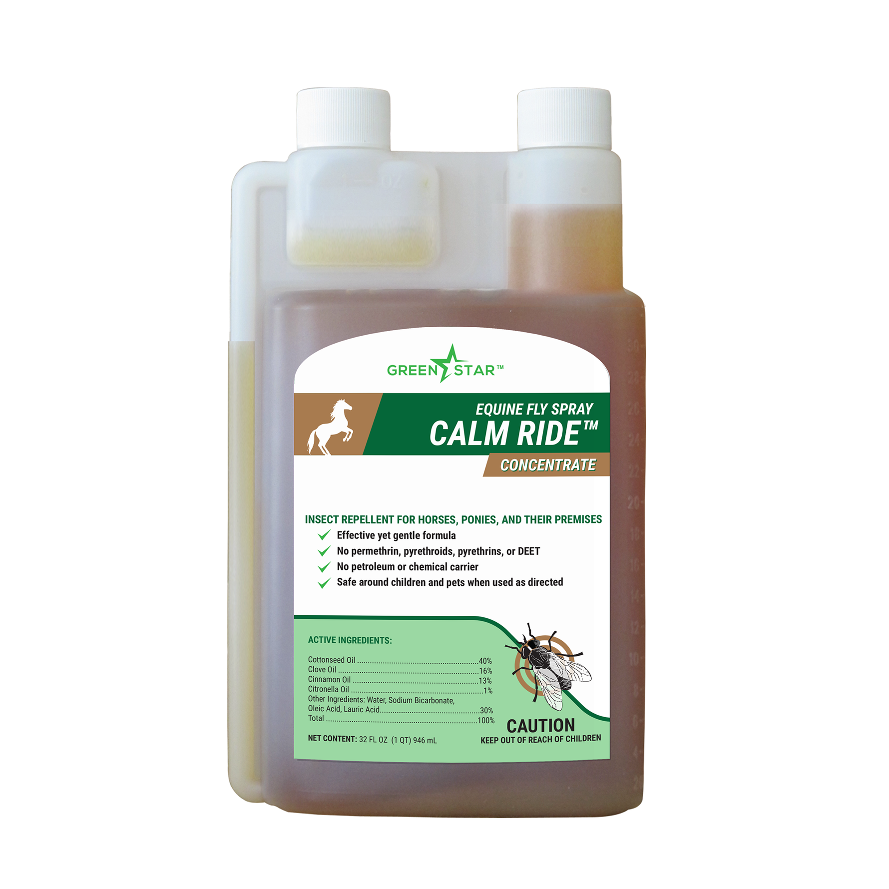 Calm Ride is a natural insecticide that keeps annoying insects away from your horses and their living environments. Made with a combination of essential oils, Calm Ride is a highly effective insect repellent that safely keeps flies and ticks away from your horses.