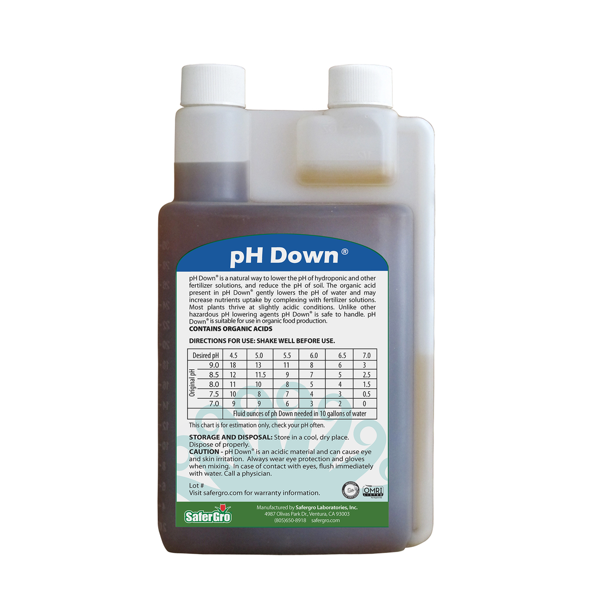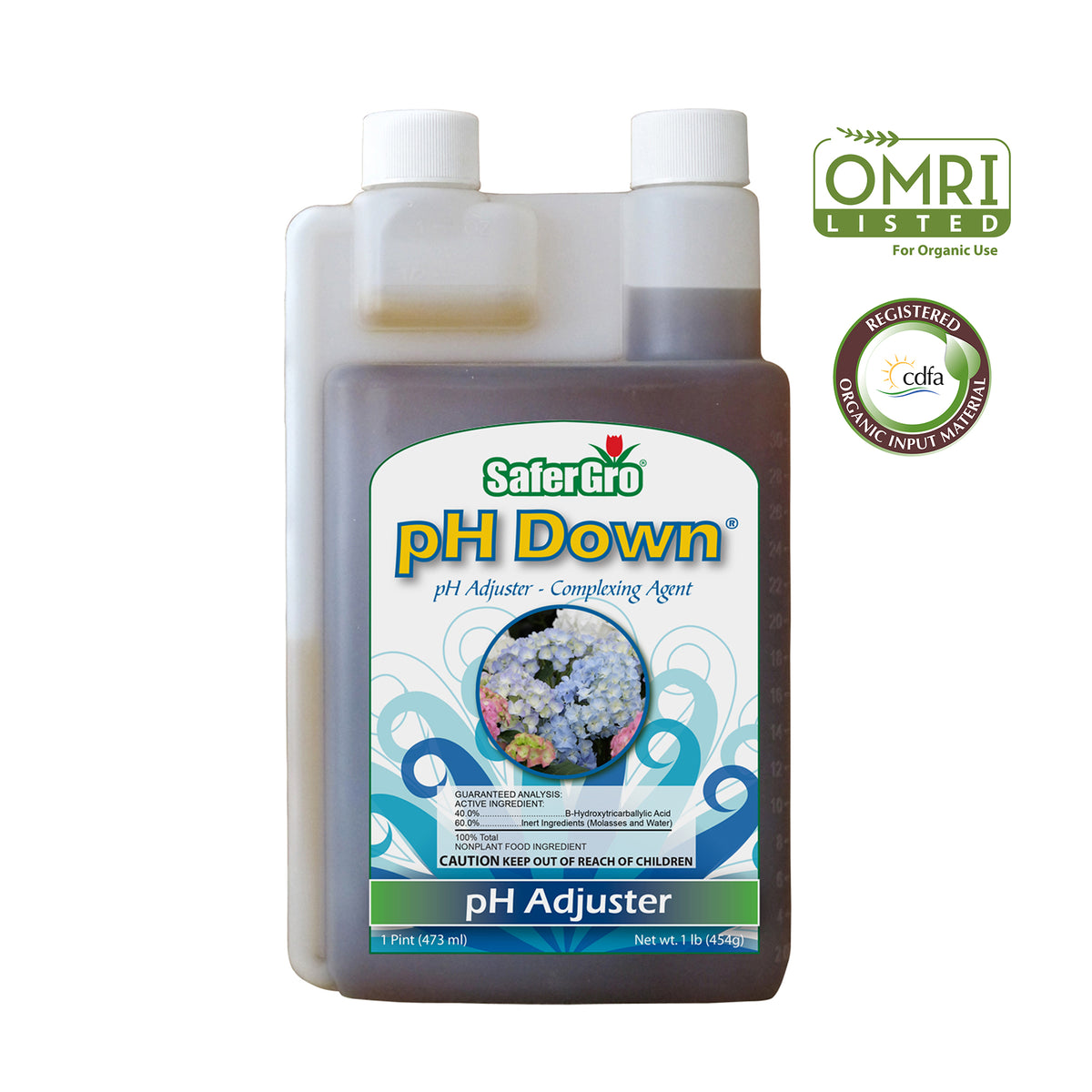 pH Down™ is an additive designed to lower the pH level into a more acidic range. The organic acid in pH Down gently lowers the water pH, making the nutrients more available and increasing uptake. Unlike other hazardous pH lowering agents, this product is safe to handle and suitable for use in organic food production.